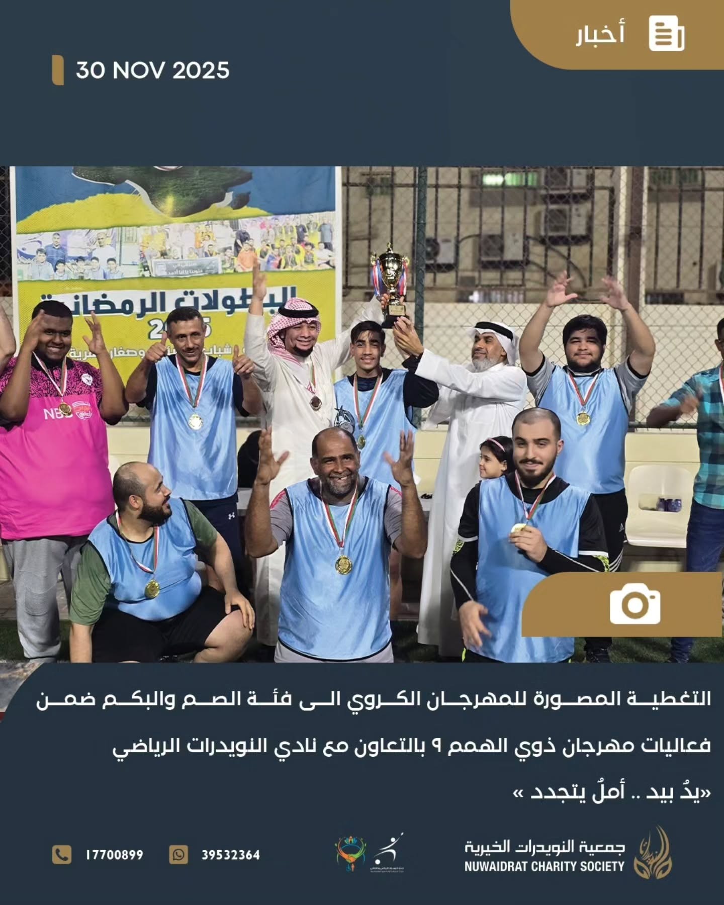 ضمن البرامج المصاحبة لمهرجان ذوي الهمم التاسع «يدٌ بيد.. أملٌ يتجدّد»، نظّمت جمعية النويدرات الخيرية بالتعاون مع نادي النويدرات الرياضي فعالية رياضية مميزة مخصّصة لفئة الصم والبكم، في أجواء مفعمة بروح التحدي والإصرار.