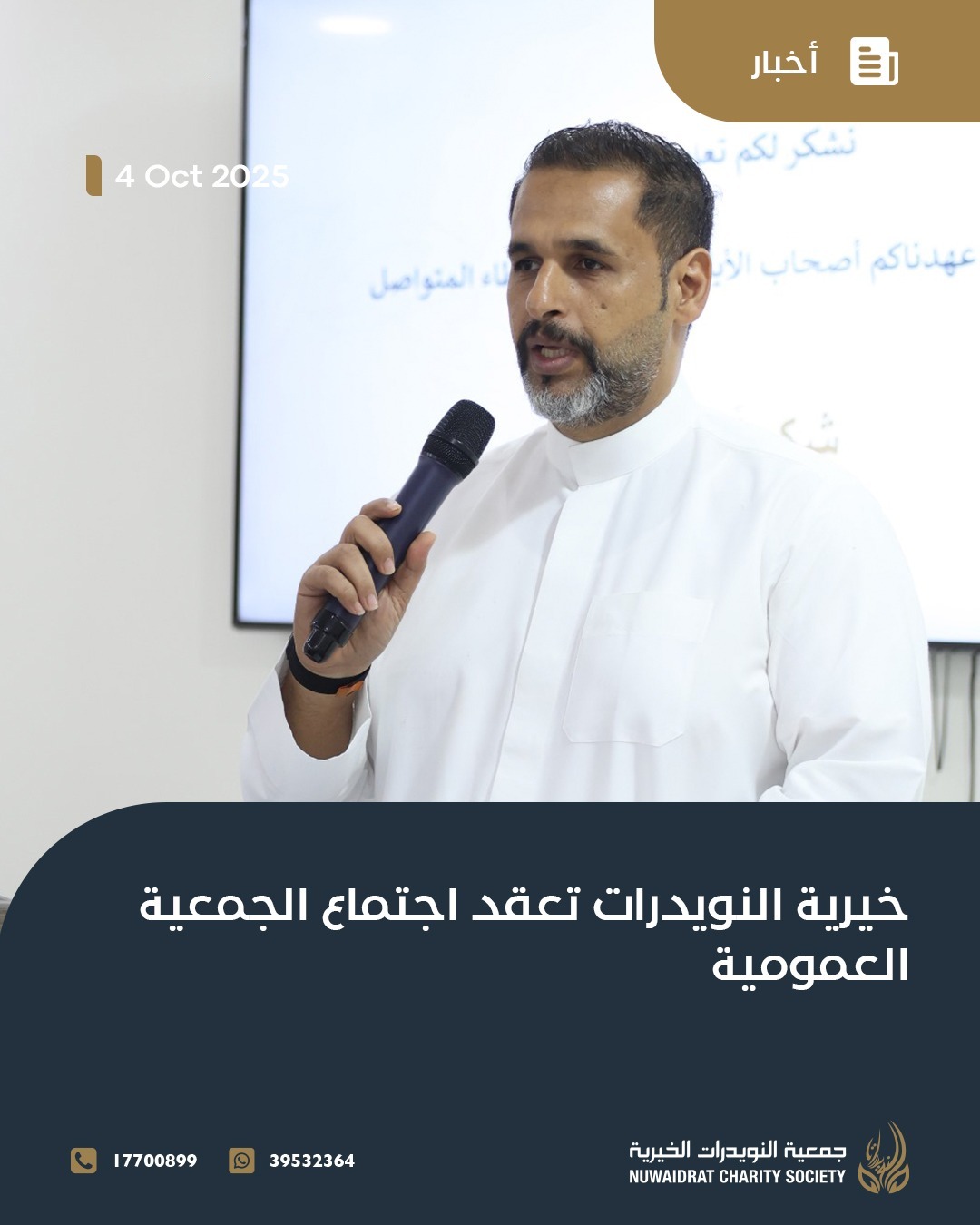 The General Assembly of the Nuwaidrat Charity Association held its regular meeting on Saturday, October 4, 2025, to elect a new Board of Directors for the association. The meeting was chaired by Shaker Darbas, Chairman of the Committee Supervising the Association's Elections. The meeting reviewed the literary and financial reports for the previous session by the Association's former Chairman, Mr. Abdulnabi Jassim, and discussed them with the attendees. The reports were then approved. The former Chairman then announced the resignation of the board.